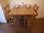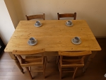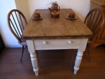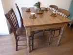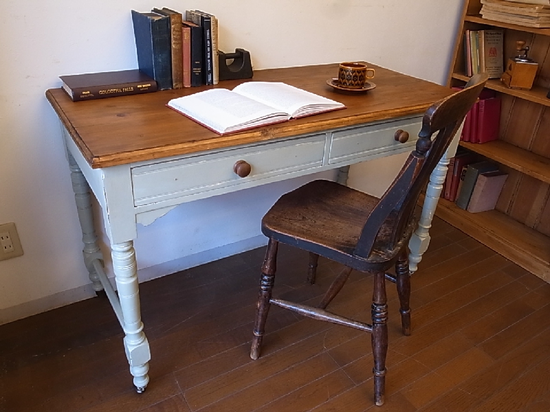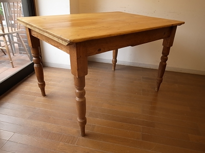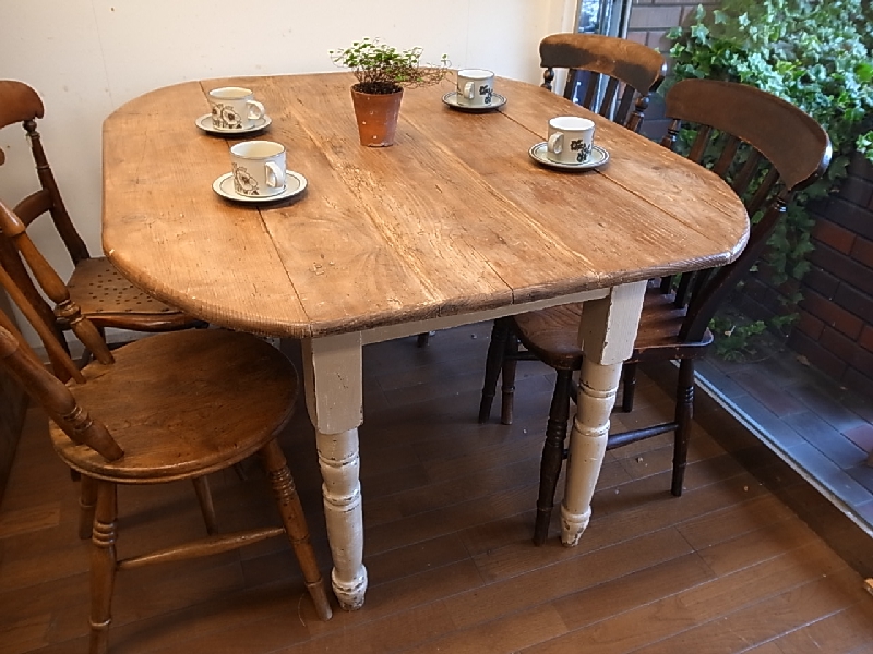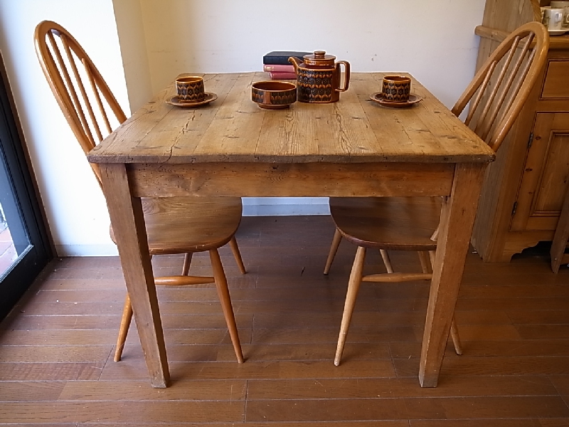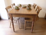 パインフラットのアンティークパインダイニングテーブルは、きれいな状態の良いものよりは、ペイントが剥げていたり、ワレや補修がなされていたりと、ちょっとシャビーシックなものです。あめ色になったテーブルのトップはなんとも言えないいい雰囲気なんです。